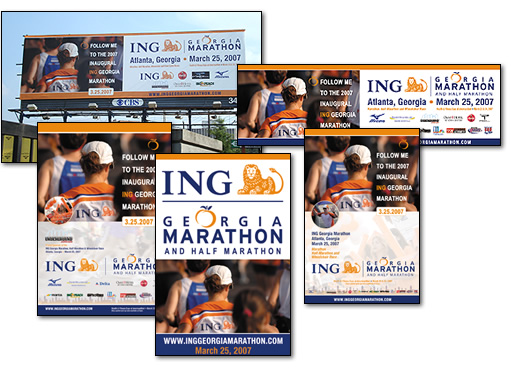 ING Georgia Marathon Layout and design of a series of outdoor advertising items for ING Georgia Marathon, promoting Georgia's 2007 inaugural ING marathon. Responsibilities included client consultation, art direction, layout and design for all of ING Georgia Marathon's local outdoor advertising to be displayed on billboards, posters, backlit displays, street pole banners and bus stop displays. Other work included designing self-mailer brochures, registration forms, online banner ads. © 2006-2007 ING Georgia Marathon, LLC. All Rights Reserved. |