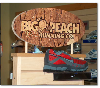 Big Peach Running Co. Creative concept and design of Big Peach Running Co.'s POS store display sign to promote their "Trail Running" shoes. Responsibilities included client consultation, art direction, stock photography management and selection, layout and design. © 2007 Big Peach Running Co. All Rights Reserved |