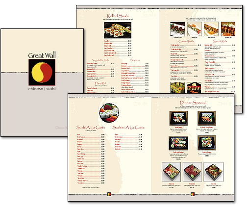 Great Wall - Chinese/Sushi Restaurant Creative concept & development, design and layout of Great Wall Restaurant's dine-in and carry-out lunch and dinner menus. Responsibilities included client consultation, art direction, layout & design and printing management. All work performed during my employment with Grip Marketing® © 2005 Great Wall Chinese and Sushi Restaurant. All Rights Reserved. |