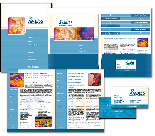 Ambiss Network Solutions Freelance project during 2007. Responsibilities included client consultations, research, brand development, art direction, design and layout for various marketing collateral pieces, including presentation folder with step-ladder inserts, corporate brochure and business cards, among others. © 2007-2008 Ambiss Network Solutions. All Rights Reserved. |
