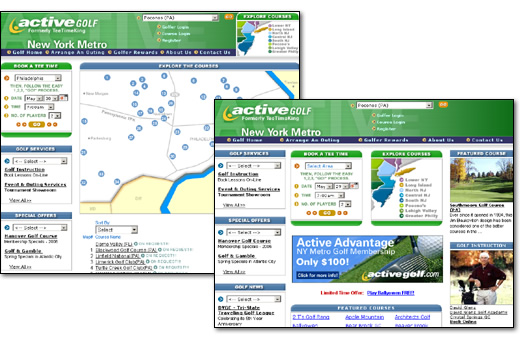 Active Golf - Formerly Tee Time King Freelance project during 2001-2005. Responsibilities included client consultation, art direction and design of this online tee times golf portal site, followed by multiple other national and Canadian branch sites. Other work included design and production of all golf site maps, online banner ads, collateral material and multiple magazine ads. © 2005-2008 The Active Network, Inc. All Rights Reserved. View live site at www.teetimeking.com |